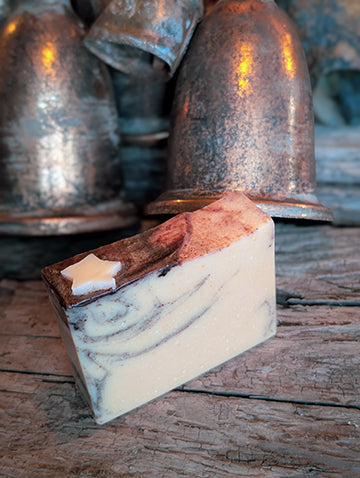 This soap began a year ago, when, as the Oak kings power started to wane and the Holly King took over a howling wind blew a snow storm through our forest. The kind with fat flakes that make it seem like the sky is falling. I collected bowls of fresh fallen snow as it fell and distilled it to produce the soap I would use to represent the falling snowflakes in this bar. The base of the bar being made with mineral rich, nourishing goat milk from our own boreal herd of woodland goats. Fuzzy with their winter coats once again.